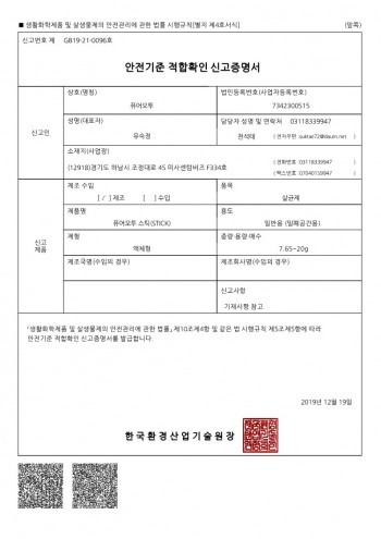 안전기준 적합확인 신고증명서(살균제,탈취제,세정제)
